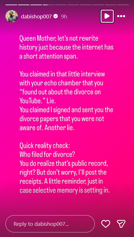 In a resurfaced interview from July 2023 with Teju Babyface, Damasus alleged that she discovered her marriage had ended not through a direct conversation, but via a video posted online.