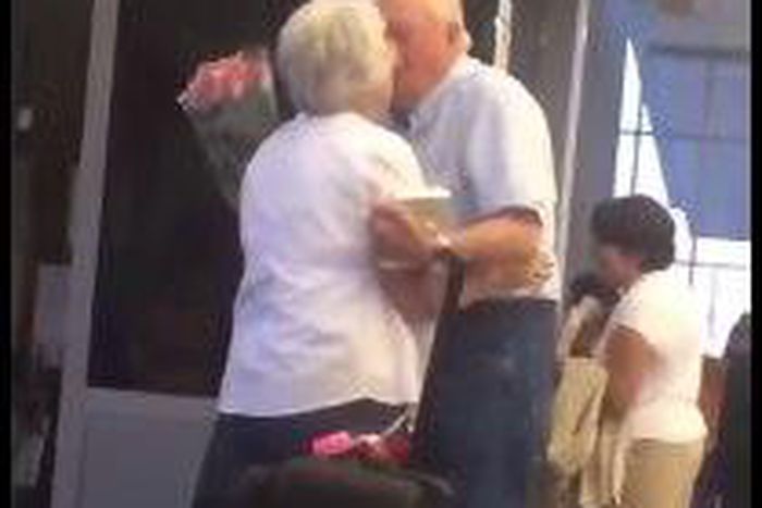 The man's elderly wife finally arrived and the pair were locked in a long embrace and shared kisses too, which left everyone around them amazed. The elderly couple were oblivious to their environment which made their reunion scene more adorable.