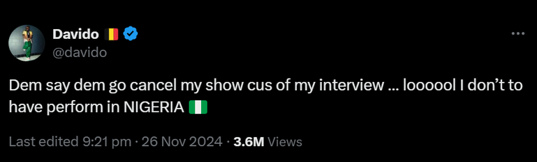 Davido has now taken to his social media to allege a plot to cancel his December concert over his interview. The hitmaker however maintained a defiance by stating he doesn't have to perform in Nigeria.