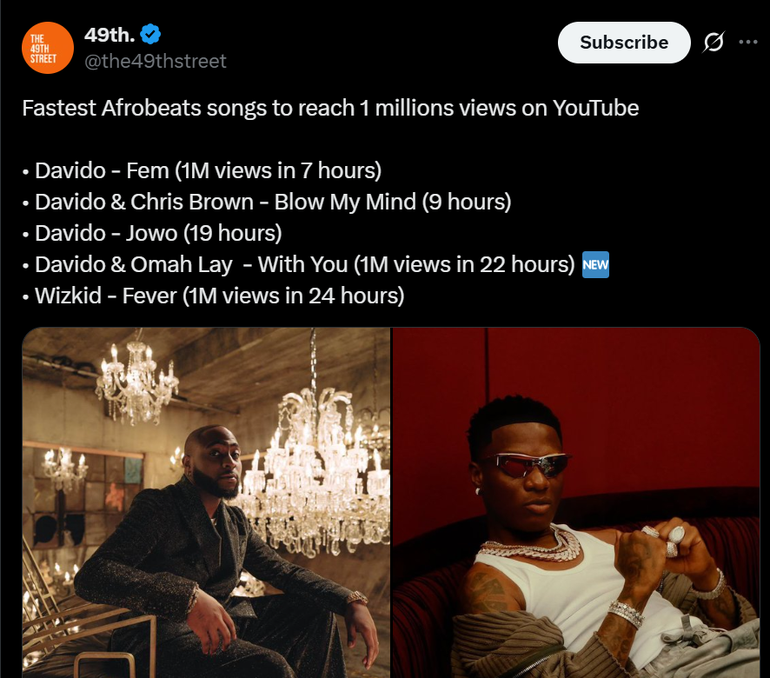 Davido extends his record of most Nigerian music videos to cross 1M views in 1 day