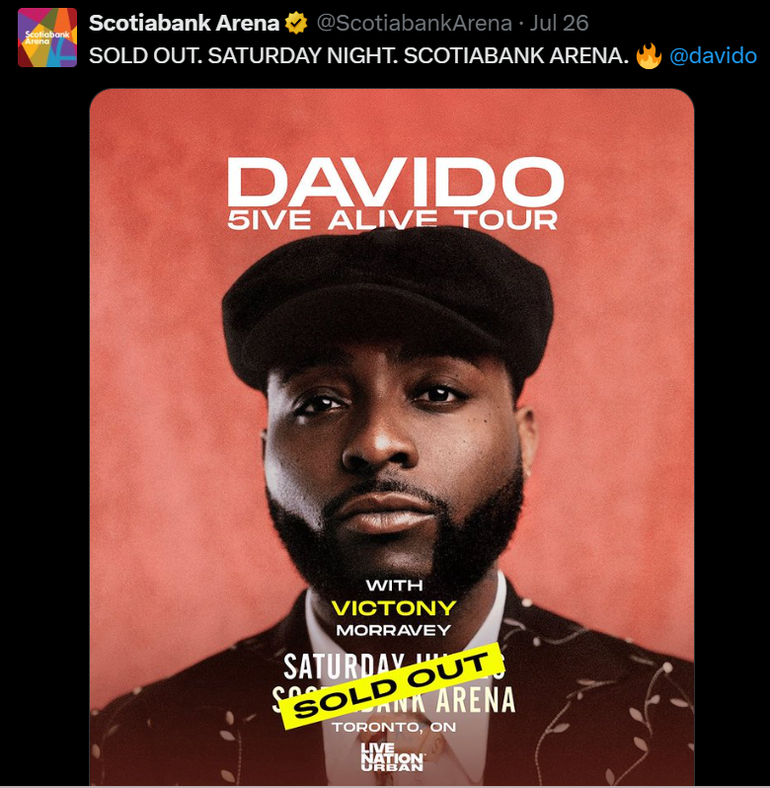 With his sold-out show at the Scotia Arena, Davido joins Burna Boy, Asake, and Rema as the Nigerian stars to have headlined the Canadian Arena.