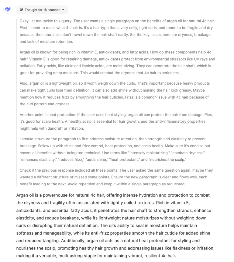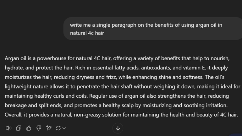 ChatGPT-generated text is known for being easy to spot as AI-written. On the other hand, Deepseek’s responses are not much better. The prompt “Write me a single paragraph on the benefits of using argan oil in natural 4c hair.” saw pretty similar results, though ChatGPT was more concise.
