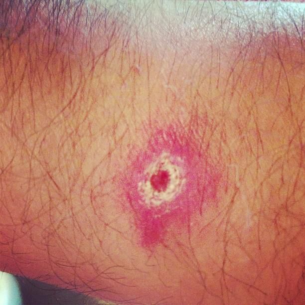 5) Brown Recluse Spider Bites The brown recluse (also known as the fiddleback spider or violin spider) is one of the most venomous spiders in America, but they are limited to very specific geographic regionsif you don't live in one of these places, it's highly unlikely you need to worry about this type of bite, Vetter says. (Check out this map to see if you're in the danger zone.) And despite what you may have heard, even where brown recluses are present, they rarely bite, he adds. To identify a brown recluse, look for six eyes arranged in pairs. (Although getting close enough to see the eye pattern on a spider sounds, frankly, terrifying.) Brown recluse bites do happen though, and when they do, they are often described by "sharp burning pain," Arnold explains. Within several hours, the bite area becomes discolored and forms an ulcer that can takes several weeks to heal. In addition to the wound, individuals can also develop fevers, muscle aches, and in rare cases, severe anemia as a result of the venom. Start by treating any bite at home with cold compresses and an antibiotic cream, but if you start to show severe symptoms, including a lot of swelling, increased pain, fever, spreading rash or other sign of infection, get medical attention immediately, he adds. There isn't an antivenin, but they can treat the symptoms and manage the infection. See the original post on Instagram ashley_parsons@Instagram