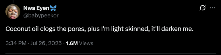 But this week, a viral tweet threw the internet into chaos: a light-skinned Nigerian woman claimed she doesn’t use coconut oil because it darkens her complexion.