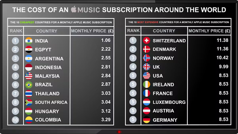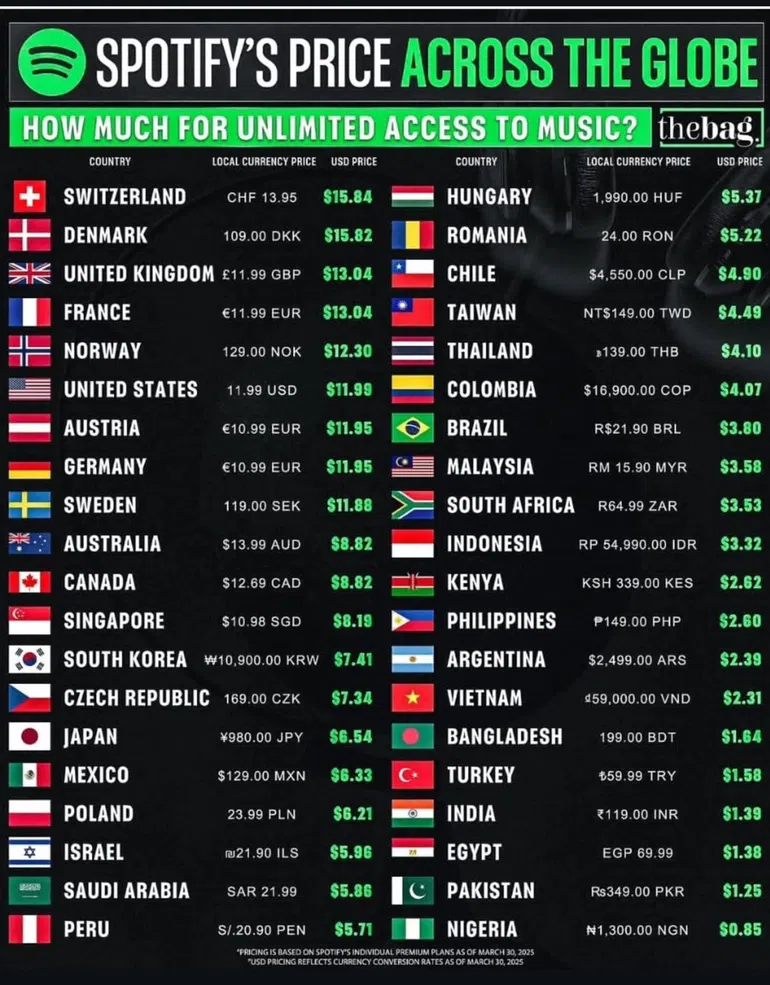In Nigeria, Spotify, for example, charges 1,600 (a little over $1) monthly for its premium individual plan, while YouTube Music and Apple Music charge 1,300 (Just under a $1) for the same plan. In the United States, an individual premium plan costs $13 on Spotify and $11 on Apple Music. In most European countries, Spotify's individual premium plan costs €11.99 per month, while YouTube Music and Apple Music cost €10.99.