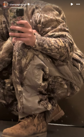 In the second selfie, Drake sported a camo gear with matching Timberland Boots.