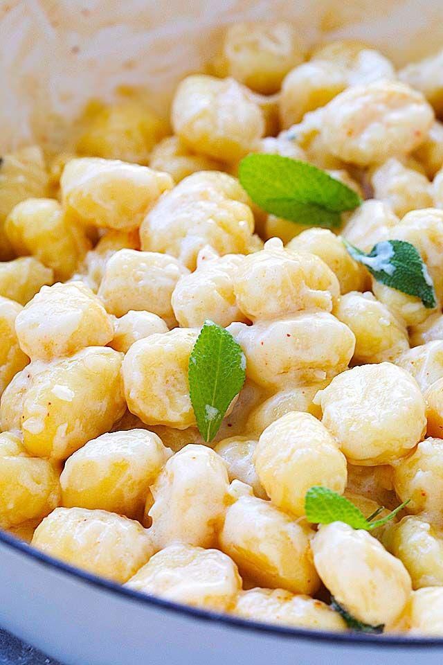 Creamy Garlic Parmesan Gnocchi Want something simple with a side of cheese? This quick dish is like adult mac. GET THE RECIPE Per serving (using potato gnocchi): 468 calories, 20 g fat (8 g sat), 759 mg sodium, 64 g carbs, 4 g fiber, 9 g protein Rasa Malaysia