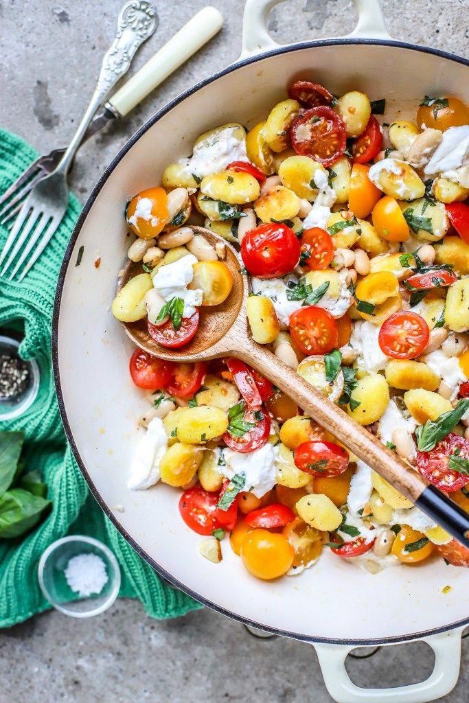 Pan-Fried Caprese Gnocchi With Burrata & Beans This Caprese gnocchi is best in the summertime when tomatoes are in season, but really it works any time of year. GET THE RECIPE Per serving (using potato gnocchi): 429 calories, 20 g fat (8 g sat), 495 mg sodium, 52 g carbs, 1 g sugar, 5 g fiber, 16 g protein Food to Glow