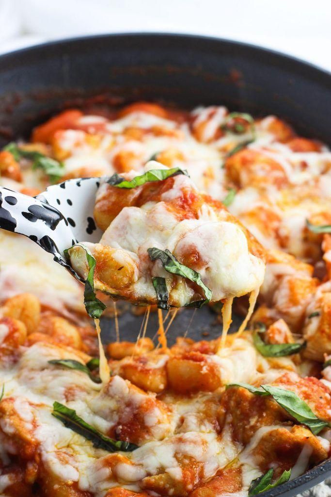 Chicken Parmesan Gnocchi Skillet Think chicken parm can't get any better? Go ahead and add cauliflower gnocchi to the mix. GET THE RECIPE Per serving (using potato gnocchi): 563 calories, 21 g fat (6.5 g sat), 1291 mg sodium, 44 g carbs, 4 g sugar, 3 g fiber, 49 g protein My Sequined Life