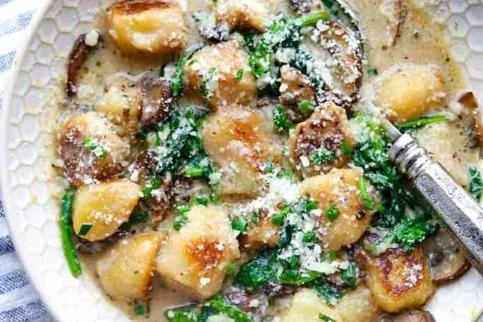 Cauliflower Gnocchi in Asiago Mushroom & Spinach Sauce If you like mushroom risotto, this mushroom gnocchi is about to rock your world. GET THE RECIPE Per serving: 461 calories, 22 g fat (13 g sat), 255 mg sodium, 92 g carbs, 5 g sugar, 5 g fiber, 23 g protein Kevin Lynch