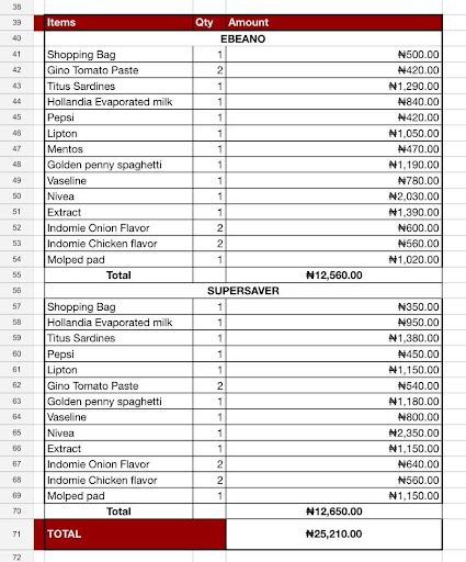 From the comparison, Ebeano came out slightly cheaper, with a total of ₦12,560 compared to ₦12,650 at SuperSaver, a difference of ₦90. While that may seem small at first glance, it becomes significant if you shop frequently or in bulk. The interesting part is that not every item was cheaper at Ebeano.