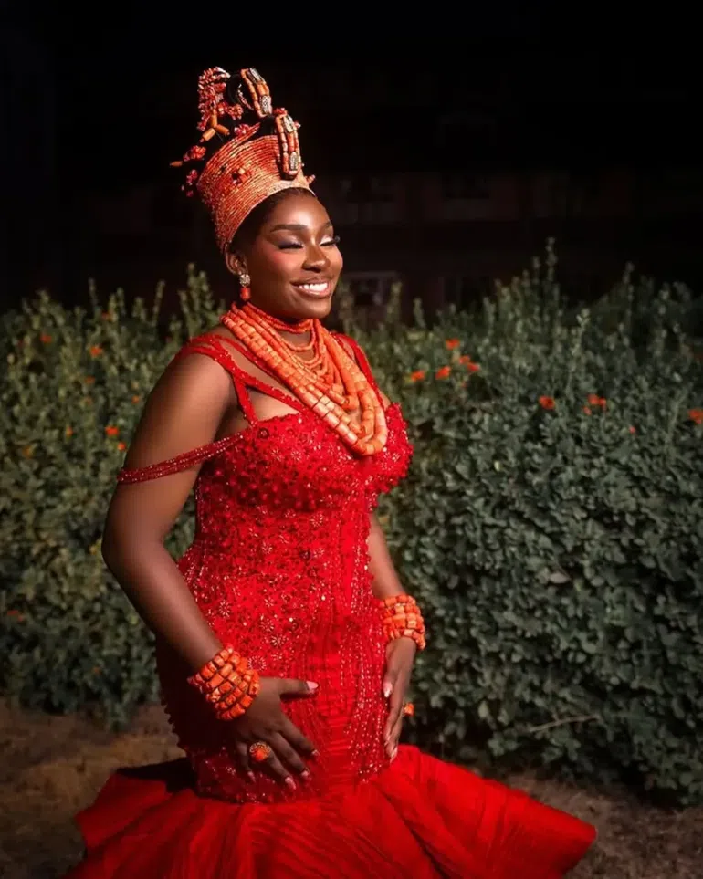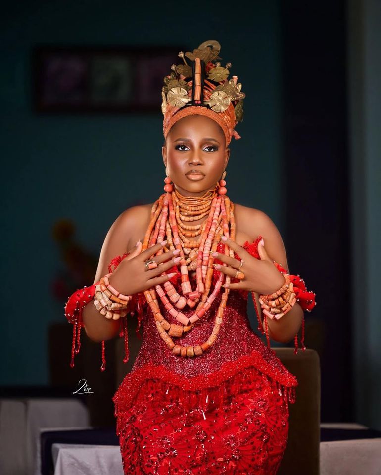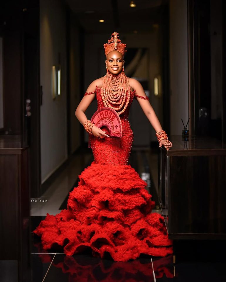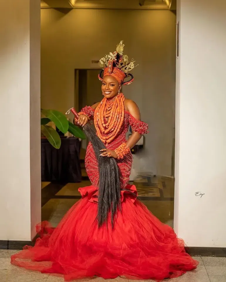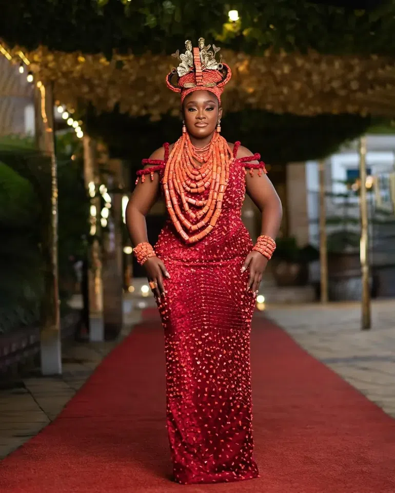 Edo brides' attire is an unmistakable highlight of the celebration. Traditionally, they wear rich red fabric known as Ododo. The bride is styled like a queen, draped in coral beads from head to toe, including elaborate bead crowns (okuku), bracelets, and necklaces.