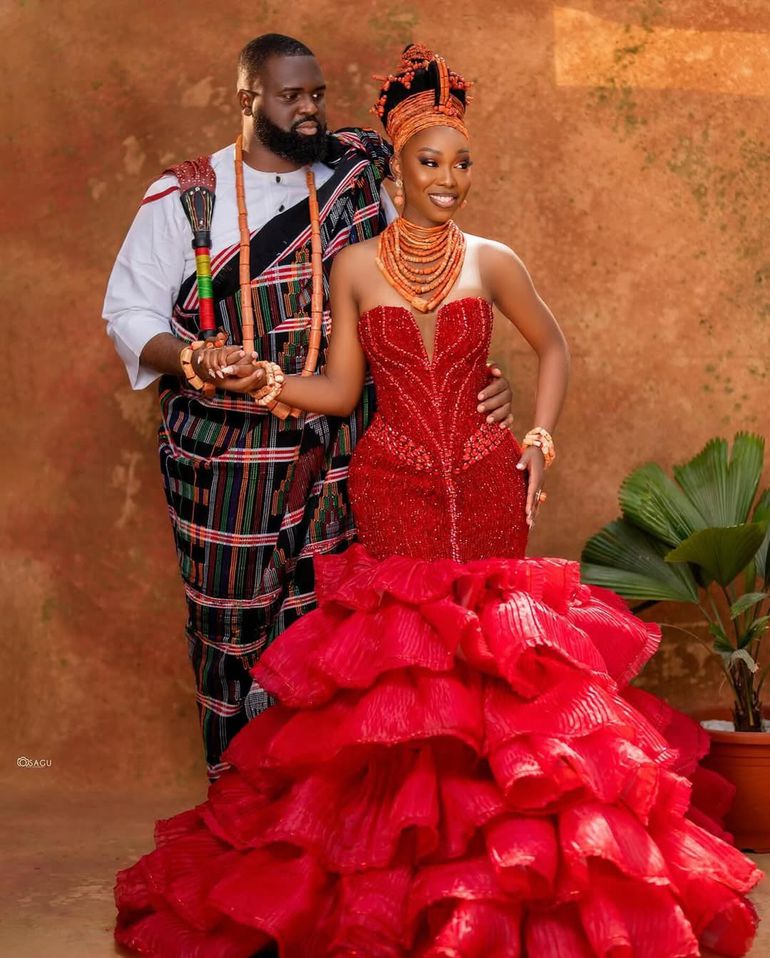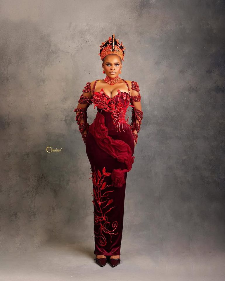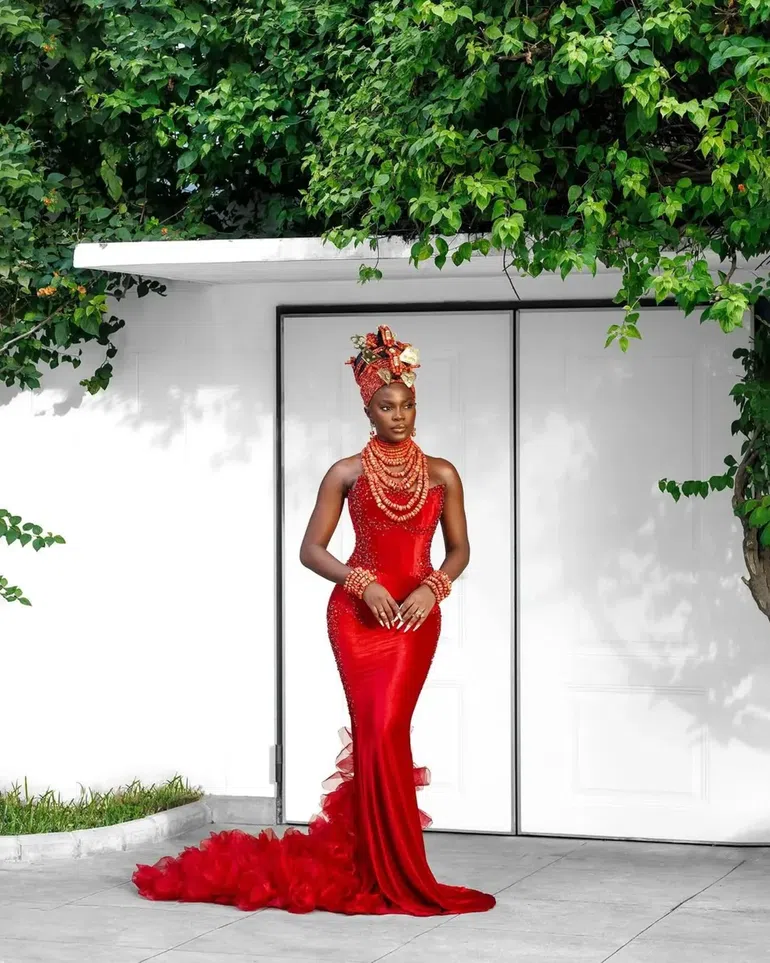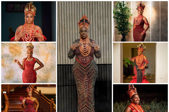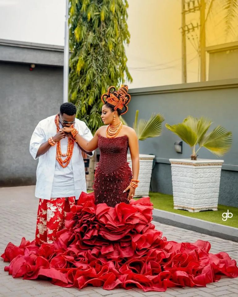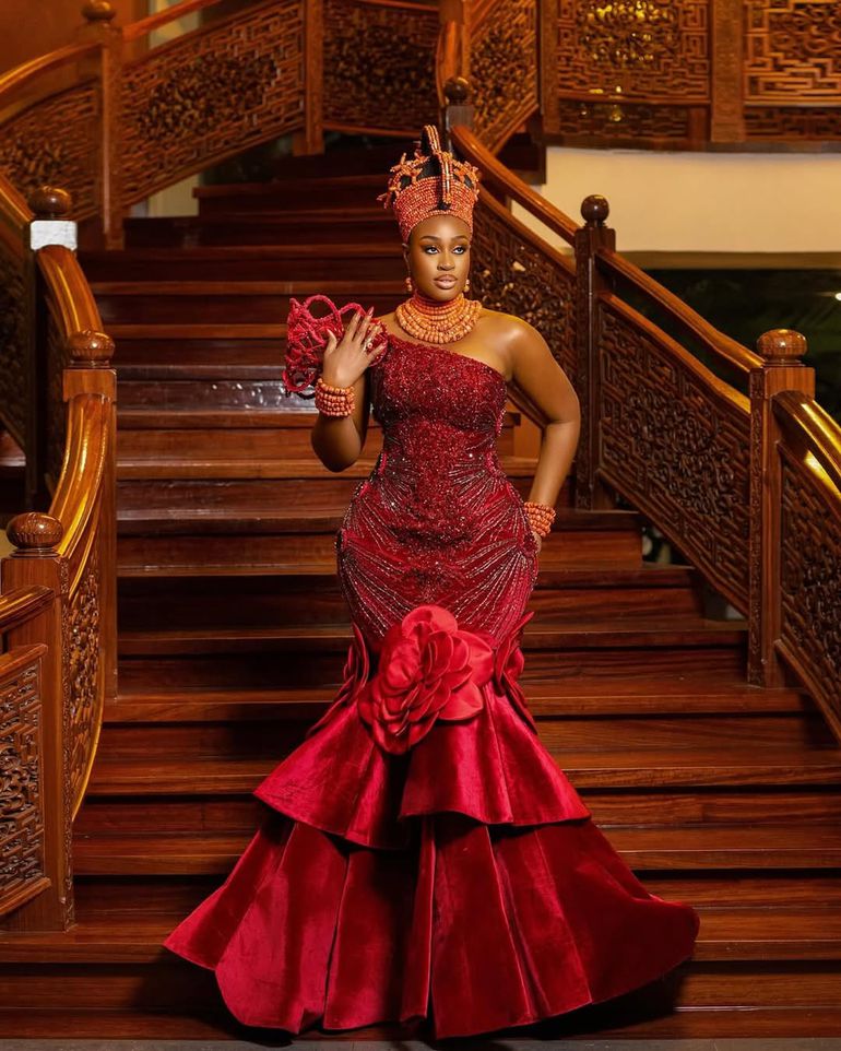 Edo brides' attire is an unmistakable highlight of the celebration. Traditionally, they wear rich red fabric known as Ododo. The bride is styled like a queen, draped in coral beads from head to toe, including elaborate bead crowns (okuku), bracelets, and necklaces.