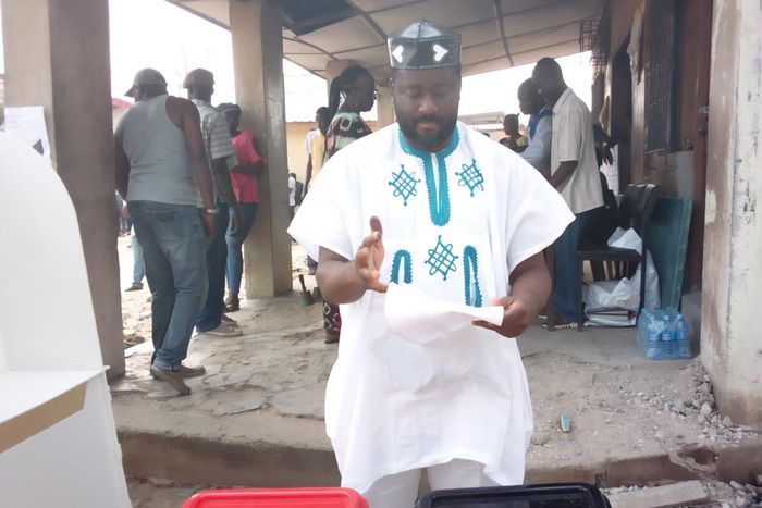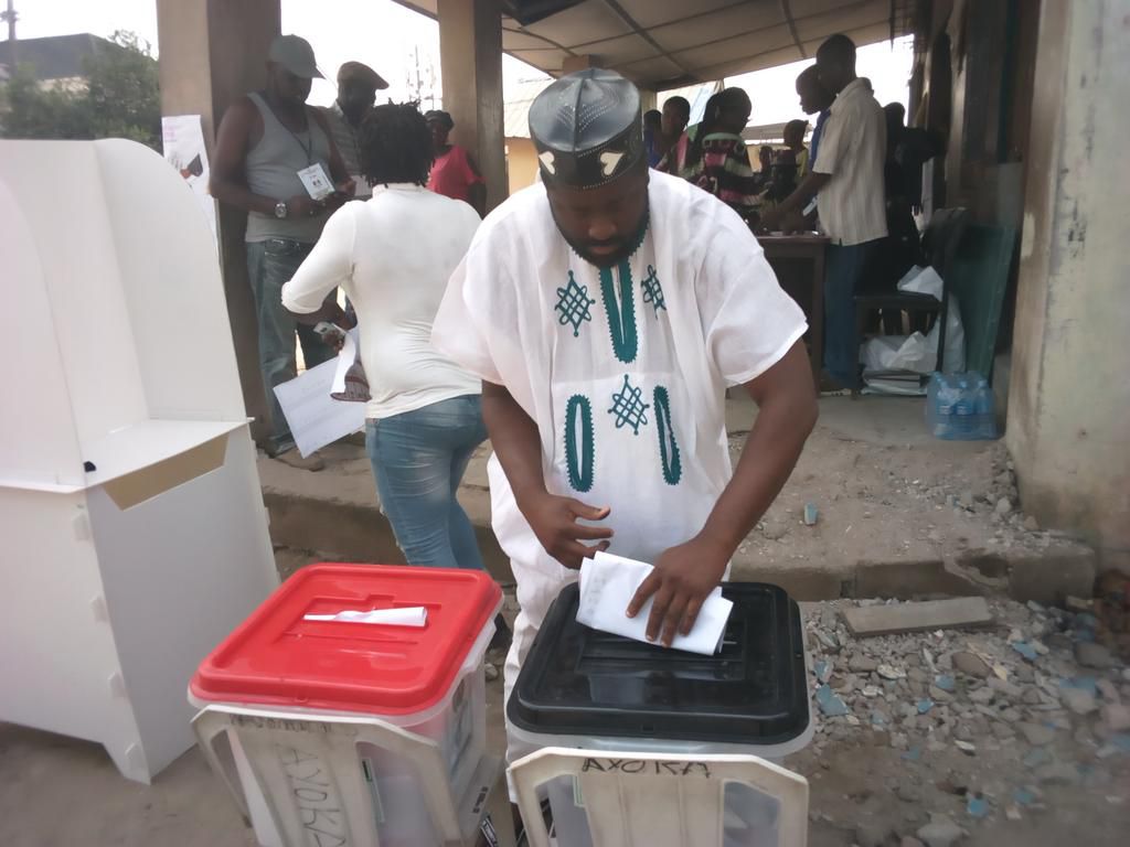 Desmond Elliot, (APC-Surulere 1) casting his vote at Polling Unit 020, Onitolo Community High School 1, Ward 06, Igbaja/Stadium, Surulere Local Government Area, Lagos, on Saturday March 9, 2019. (NAN Photo)