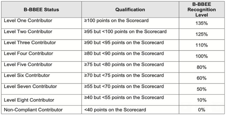 Companies operating in South Africa are assessed through a scorecard covering five areas: ownership, management control, skills development, enterprise and supplier development, and socio-economic development.