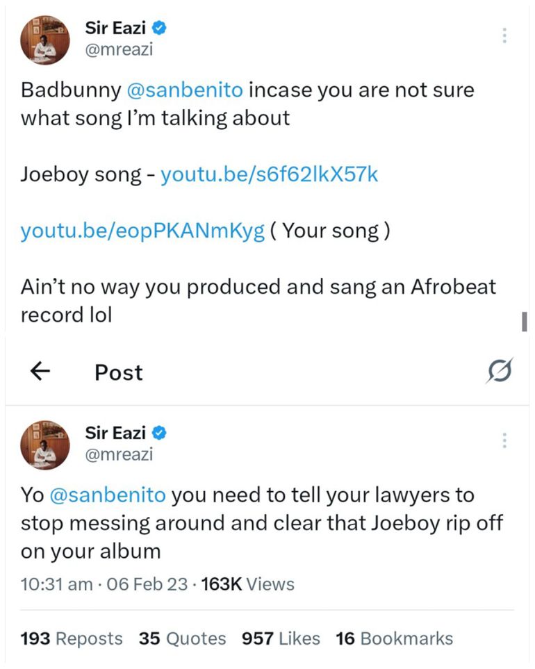 The suit was filed last May, with Mr Eazi's emPawa Africa initially named as a co-plaintiff after Mr Eazi had publicly accused Bad Bunny's team of copyright infringement and claimed they had repeatedly stonewalled attempts to secure proper credit for Dera and Joeboy.