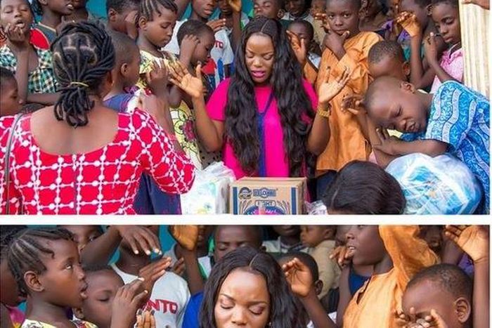 The actress also took time to pray with them. Not only is she giving them food items, she revealed that she is building classrooms for them.