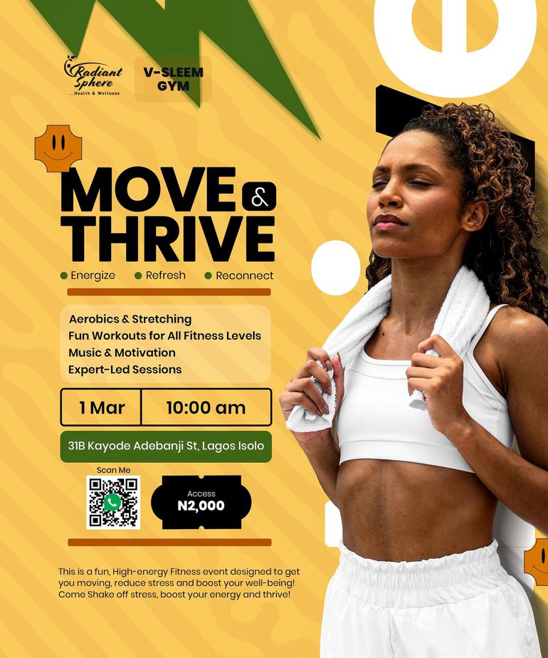 Move and Thrive is focused on engaging participants in activities like aerobics, stretching, and movement. Join other fit fam this Saturday by 10 AM at 31b Kayode Adebanji Street, Isolo. With ₦2,000, you can get your tickets online and get ready to move, refresh, and thrive.
