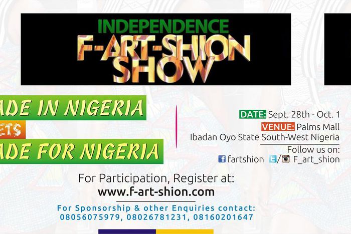 The four day event will have other side activities such as Fashion Workshop, a mini art exhibition and tour of the host city which is Ibadan, Oyo State Nigeria.The Independence F-ART-SHION Show is proudly brought to you by The Trillionbucks Company.For participation and other inquiries please visit: www.f-art-shion.com