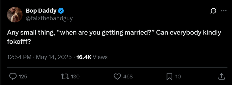 Taking to X on May 14, 2025, Falz made his stance clear on the frequently asked question about his marital status.