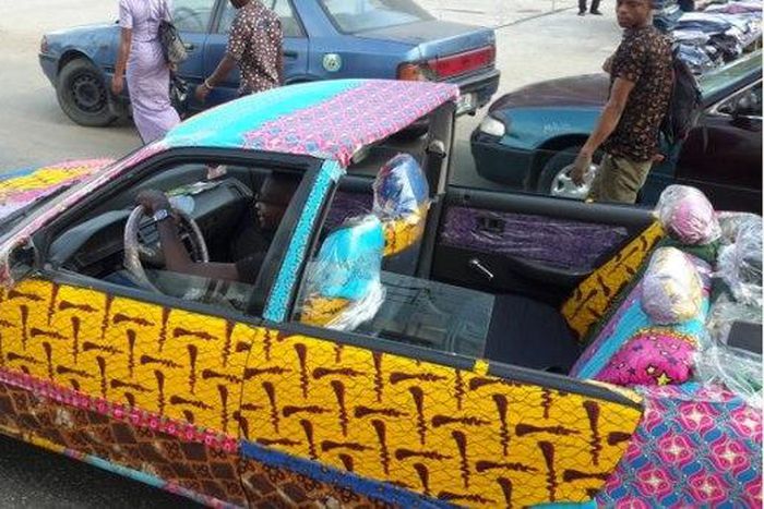 A man in Bayelsa, a state in the Niger-Delta region was seen cruising around town in a convertible car covered in Ankara material.