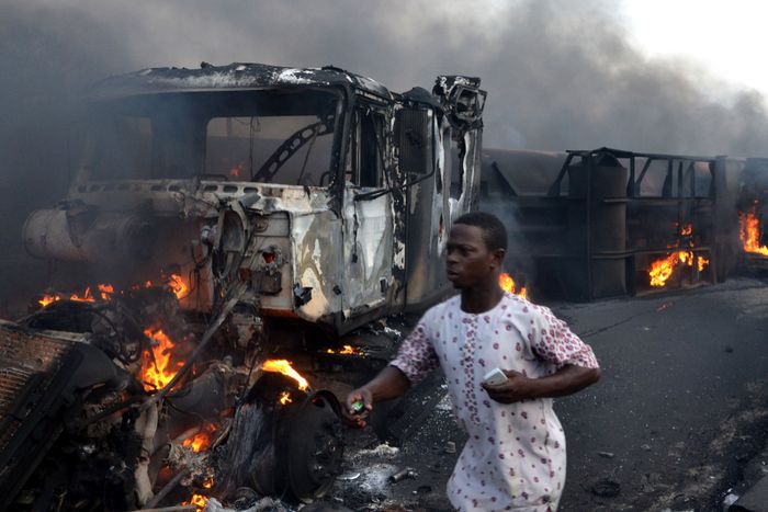 Passersby walk amid burned cars after an oil tanker exploded on a highway. [Getty Images]