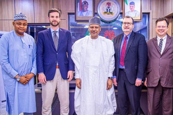 Minister of Info, Mohammed Idris (m); US Ambassador to Nigeria, Mr. Richard Mills (2nd-r); Public Diplomacy Counselor, Lee McMani (r); Spokesperson of the US Embassy, Gilbert Morton (2nd-l) during a courtesy visit to the minister on Tuesday. [Facebook]