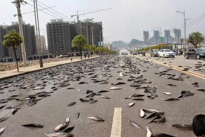 "A large truck was carrying 13,600 pounds of catfish through the Southeast Guizhou Kaili City Development Zone when the cargo door accidentally opened, causing catfish to scatter along the highway."