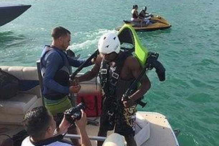 In one of the photos he shared, Mayweather is seen trying the jetpack on before he walks on water.