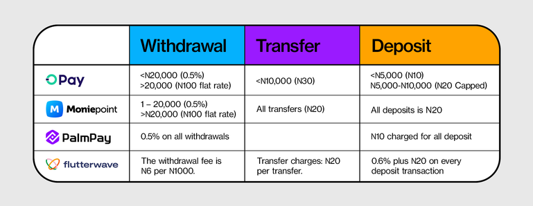 Flutterwave charges 0.6% plus N20 on every deposit transaction, regardless of the amount.Withdrawal Charges: