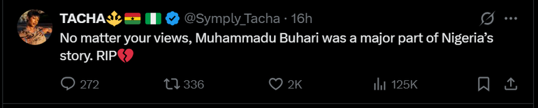 Reality TV star Tacha took the high road, offering a respectful nod to Buhari’s place in Nigeria’s politics