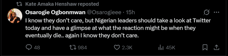 Nigerian actress and activist Kate Henshaw took to X (Formerly Twitter) and reposted another person's content which read, “I know they don’t care, but Nigerian leaders should take a look at Twitter today and have a glimpse at what the reaction might be when they eventually die.. again I know they don’t care.”