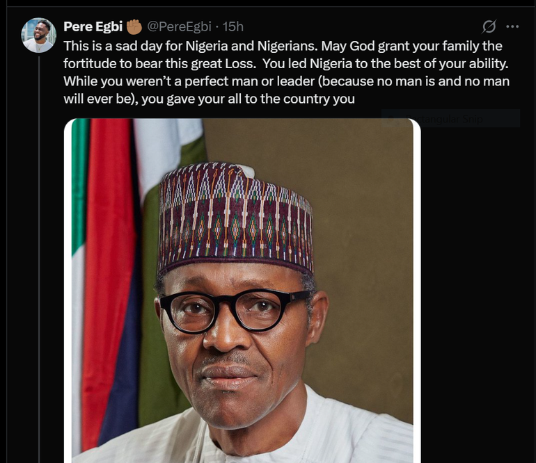 Actor and BBNaija alumnus Pere Egbi delivered one of the more balanced tributes. He acknowledged Buhari’s flaws, prayed for his family, and seized the moment to appeal to current president Bola Ahmed Tinubu.