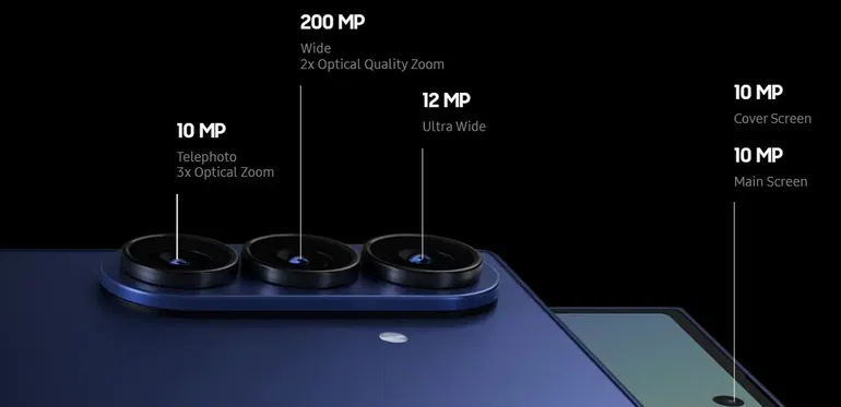 Camera: Rear – 200 MP wide + 10 MP telephoto (3× optical) + 12 MP ultra-wide; Front – 4 MP under-display + 10 MP cover camera