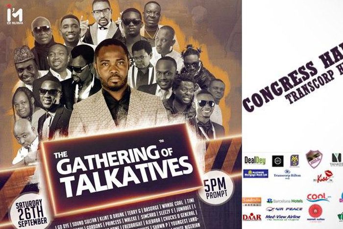 Abuja residents and other neighbouring cities brace yourself as comedy, music and dance hits the city, The concert tagged 'Gathering of Talkatives' is set to hold on the 26 September, 2015 at the prestigious Transcorp Hilton, congress hall.