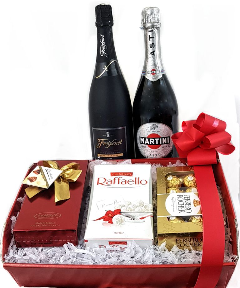 A box of luxury chocolates featuring three varieties of premium chocolates (150g each) and two bottles of sparkling wine & prosecco (70ml each). Where to Buy: Shop Flowerandballoon Price: ₦185,000.