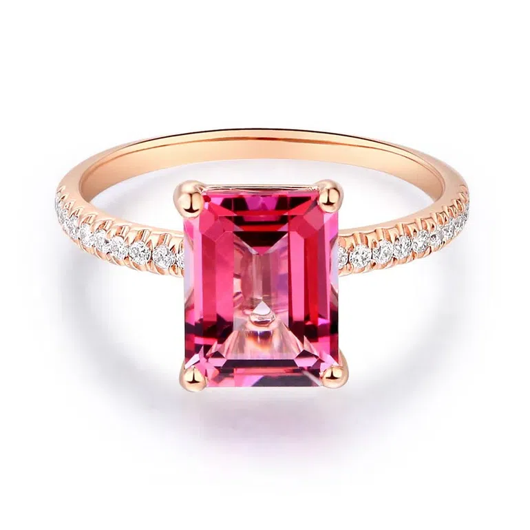 This piece is crafted from 10k gold, with an option for 18k gold, and features a stunning combination of topaz and natural diamonds. The centerpiece is an emerald-cut, 2.8-carat pink stone, complemented by round-cut side stones that total approximately 0.168 carats. The stone is graded SI in clarity and H in color, and the gold weight is around 2.2 grams.