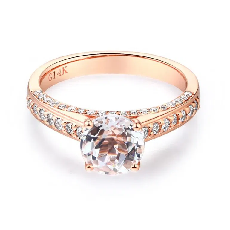 This piece is made from 10k gold, with an option for 18k gold, and features a combination of topaz and natural diamonds. The centerpiece is a round-cut, 1.2-carat clear stone, accented by round-cut side stones totaling approximately 0.426 carats, graded SI in clarity and H in color and weighs around 3.3 grams.