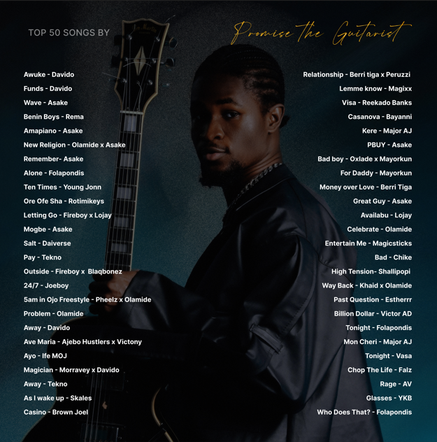 From Davido's chart-toppers to Olamide's classics and Asake's recent smashes, Promise's guitar work has been the secret ingredient in countless hits.