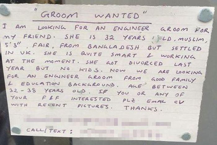On behalf of her friend, a woman in London put a notice at a shop window that said, 'Groom Wanted'.