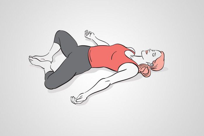 Sit on the floor with the soles of your feet together. Lay back, letting your knees fall out to the sides (if you feel pulling in the groin or hips, place yoga blocks or pillows under your knees). Hold one minute.