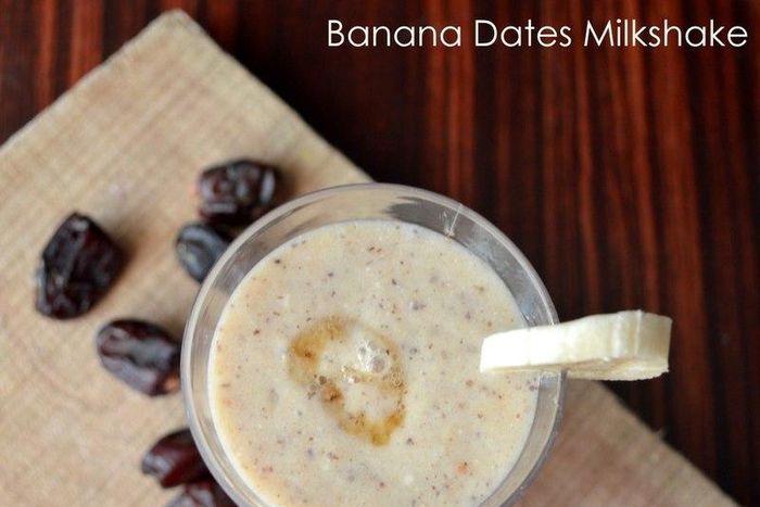Blend the dates and 1/2 cup of milk together in a blender.Add the rest of the ingredients and blend at high speed and serve in four glasses.