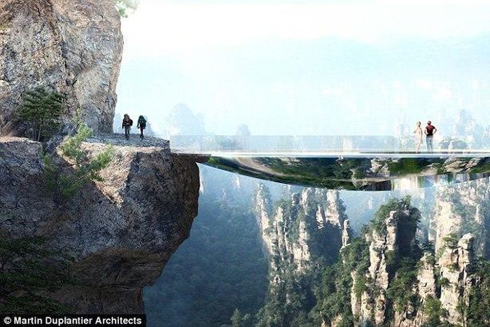 The transparent footbridge, suspended high between two mountain-tops, will cost over £4million to build and has been created by Martin Duplantier Architectes (MDA) and Daqian Landscape Architects, who won a design competition. Daily Mail reported.