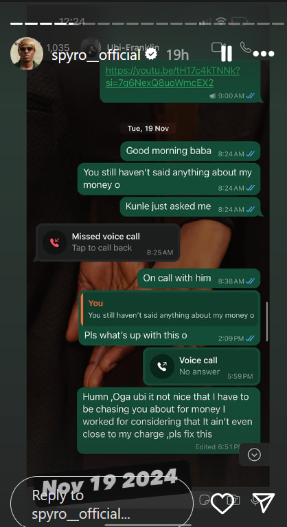 "Oga Ubi, it's not nice that I have to be chasing you for money I worked for, considering that it's not even close to my charge. Please fix this," said Spyro to Franklin in one of the WhatsApp screenshots.