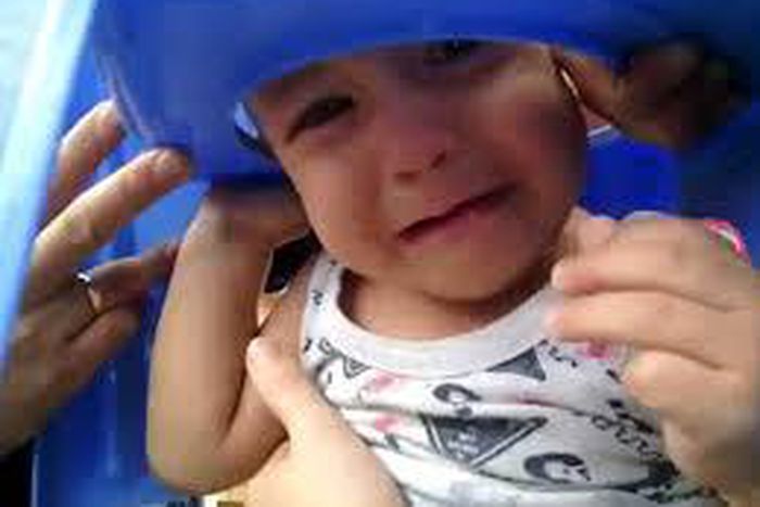 One fireman had to comfort the crying boy, who has not been named, while another cut the plastic using shears.