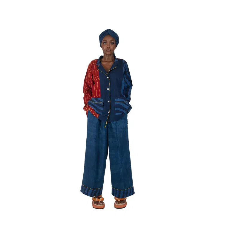 If their cotton is the canvas, then indigo is the paint that brings it to life. The brand’s distinctive blue — a spectrum of shades from bold navy to soft lavender-hued tones — is created using indigo dyeing techniques rooted in the ancient traditions of Kano’s Kofar Mata Dye Pits.