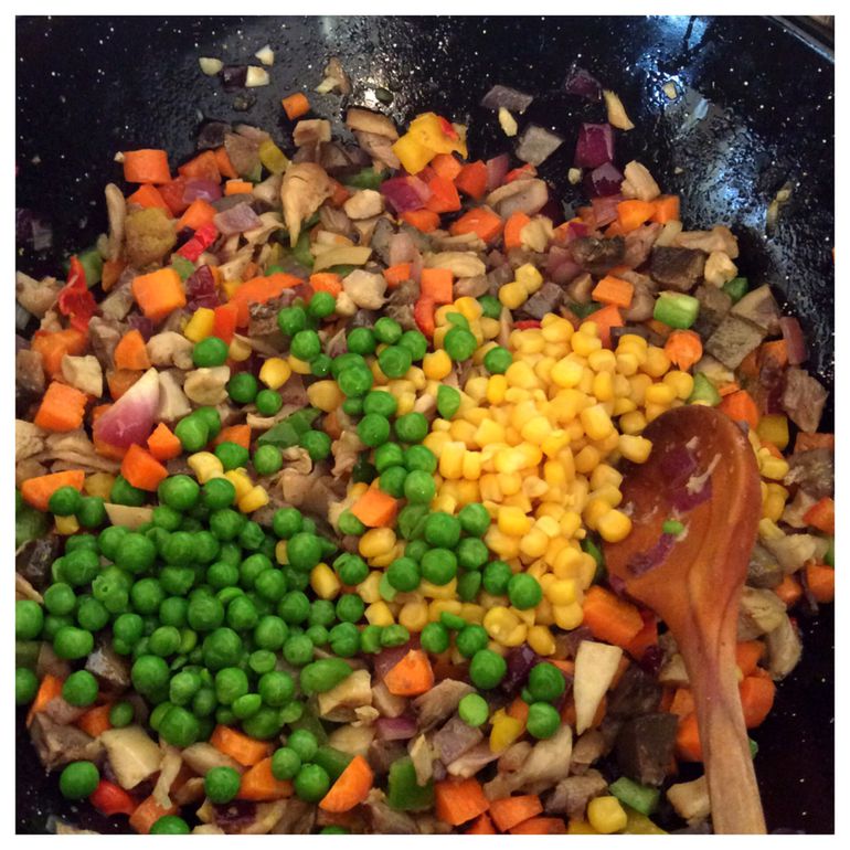 Add Veggies: Fry onions and sauté in butter for about 1 minute. Add green onions, thyme, curry powder, and cayenne pepper (if using). Pour in your mixed vegetables and bell peppers. Fry for another 3 minutes. Do not overcook. The veggies should remain crunchy. Add your fried proteins.
