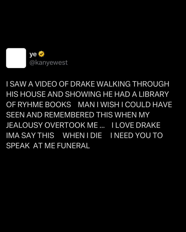 In a post on his X account where he if followed by 33 million users, YE AKA Kanye West shared that he let jealousy get the better of him and also admitted to loving Drake before requestung that the Canadian rapper speak at his funeral.