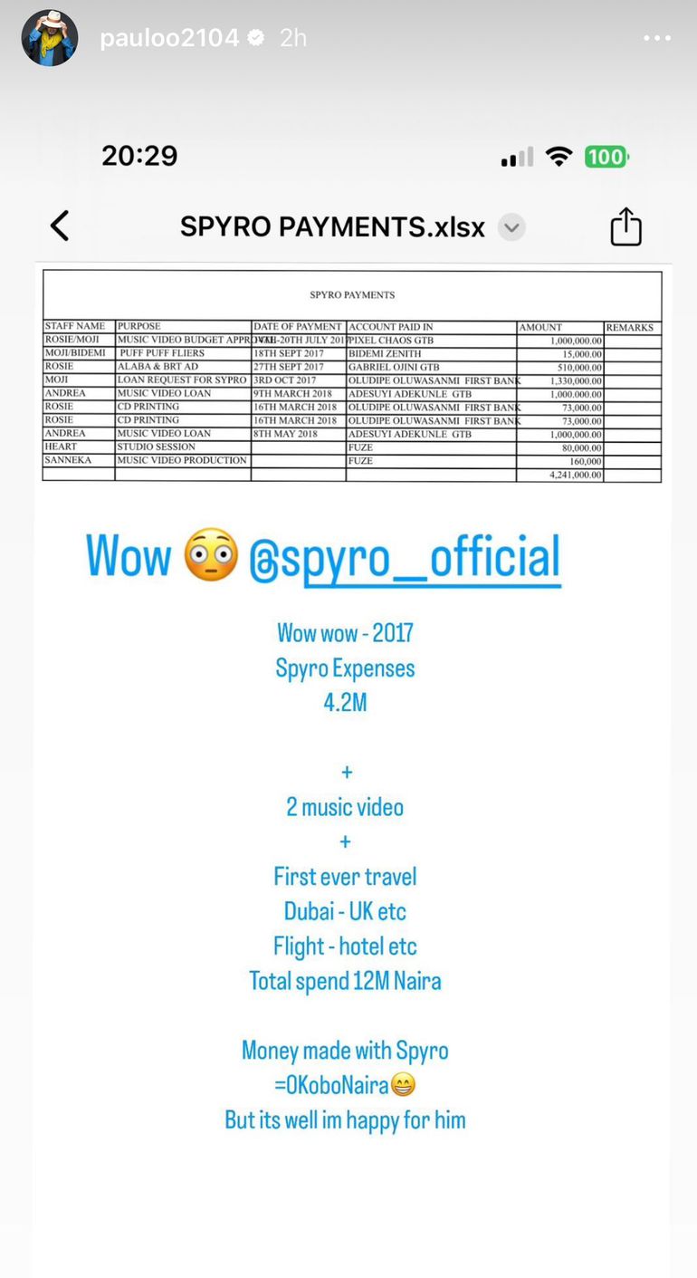 In a post on his Instagram story, the businessman shared a picture of some of the payments made in 2017 to promote Spyro including trips to Dubai and the United Kingdom.