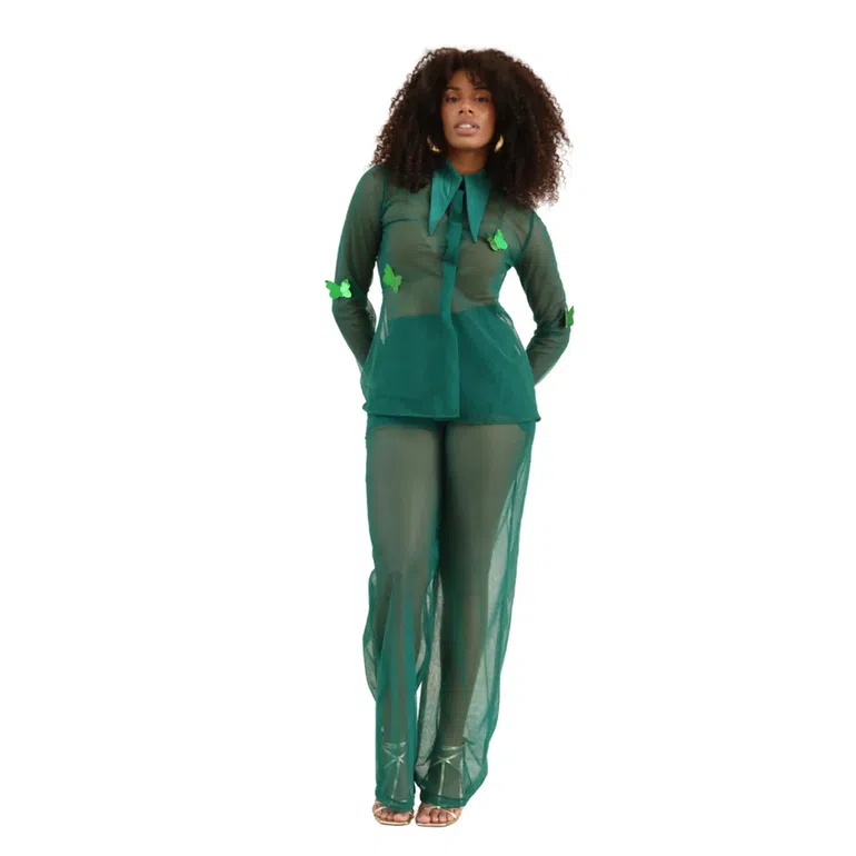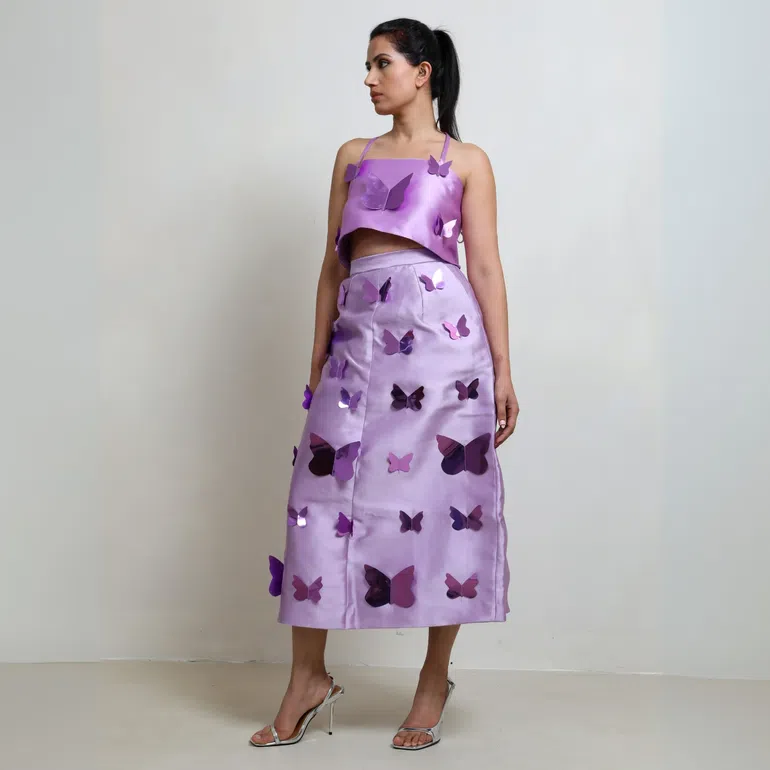 The satin crop top and embellished midi skirt make this a set for rich girl elegance. The butterflies feel intentional, not loud. Thoughtfully placed, they represent growth. It’s graceful but far from boring.